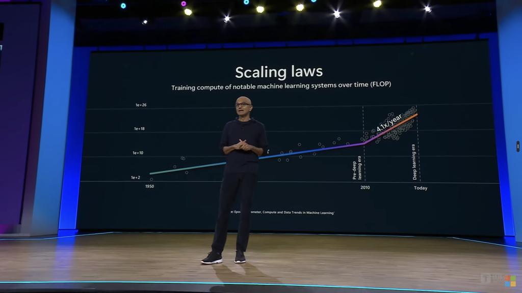 纳德拉表示,就像摩尔定律推动信息革命一样,Scaling Law(规律效应)和模型架构一起,改变了人类使用数据、生成数据的方式。