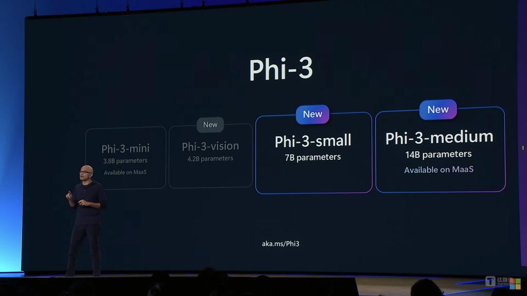4、Phi-3 家族迎来小参数模型新成员:Phi-3 Vision 、Phi-3 Small 7B、以及 Phi-3 Medium 14B,此前微软还公布了 Phi-3-mini。纳德拉介绍,Phi-3 系列模型功能强大、性价比高,且针对个人设备进行了优化。而 Phi-3 Medium 14B 的综合性能与 Mixtral 8x22B 和 Llama 3 70B 互有胜负,但却能做到几乎碾压 Command R+ 104B 和 GPT 3.5。