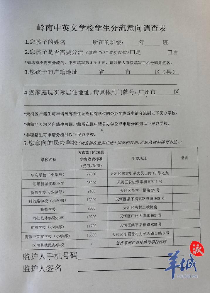 在 26 日的家长会上,工作人员还向家长分发了分流意向表,其中列出了包括华实学校、汇景新城实验小学等 8 所民办学校,并提到,有天河区户籍的学生可以申请统筹至住址周边有学位的公办学校,广州籍非天河区户籍的学生可申请所在区公办学位,同时,所有学生均可申请分流至上述民办学校。