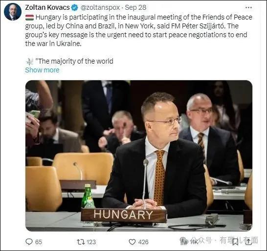 此外,匈牙利也是受邀参加 " 和平之友 " 小组会议的欧洲国家之一,其发言人科瓦奇当地时间 9 月 28 日发文透露:" 匈牙利支持这一外交努力,该计划强调外交是唯一解决方案,防止核升级,避免世界分裂为东西方集团。"