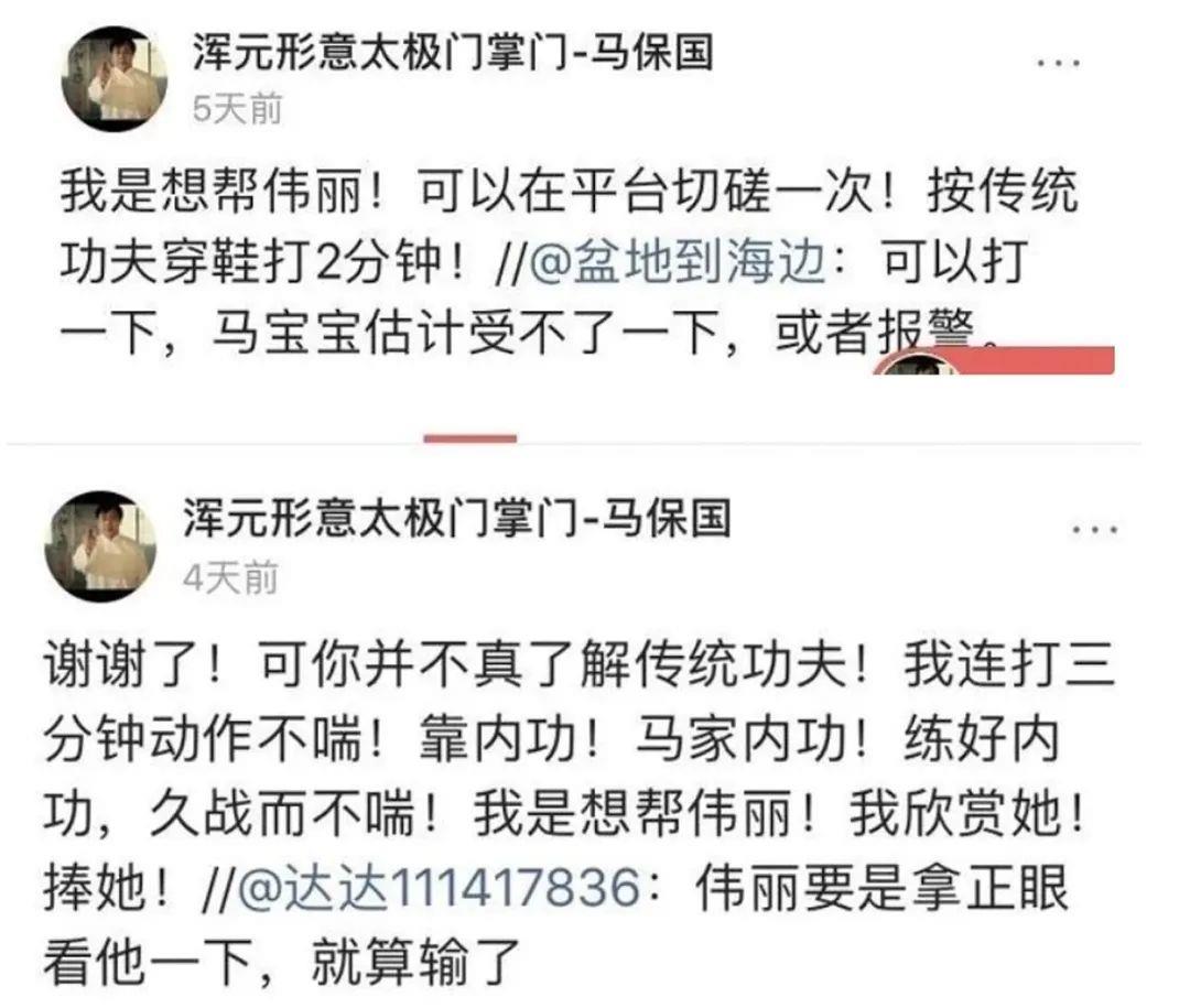 当时张伟丽卫冕成功,马保国却说张伟丽“没学到传武,打法太蠢”;还向张伟丽邀战 “硬地板上穿鞋打2分钟,我不伤她,我练内功连续大战3分钟不喘。”。