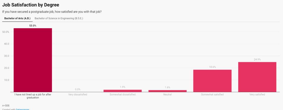 即便是全美就业情况最好的普林斯顿大学,其毕业生的就业率也在近几年逐渐下降。根据该校今年提供的调查数据,文科专业的本科毕业生中,有超过一半(53%)没有找到工作,理工科专业就业情况显然更好,仅有 25.4% 没找到工作,但仍然有 28.9% 的学生对自己工作不满意。
