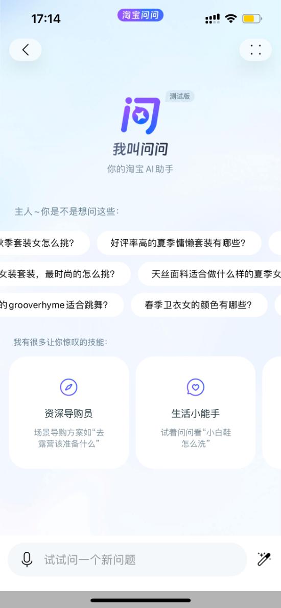 在近日举行的 " 淘宝问问 " 媒体沟通会上,北京商报记者了解到,淘宝大模型原生 AI(人工智能)" 淘宝问问 " 正在平台中进行内测。据了解,用户可以在淘宝中搜索 " 淘宝问问 " 或是 " 问问 " 进入 AI 互动页面。根据页面内容,淘宝问问带有 " 资深导购员 "" 生活小助手 "" 美食达人 "" 旅行策划人 "" 灵魂写手 " 等功能标签,可为消费者提供商品挑选攻略、商品推荐、行程建议等基本功能。