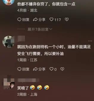 没想到评论区明事理的朋友蛮多,劝他看开点,又不是不飞了,加油表示负责,一百块的机票还把自己当大爷。