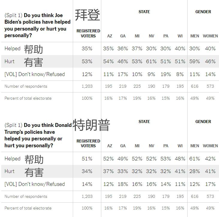 在被问到 " 拜登 / 特朗普的政策对你有帮助 / 损害 " 时,认为拜登政策造成损害的比例要比 " 起到帮助 " 的比例高出 18%;而特朗普则是正好反过来,认为他的政策起到帮助的选民要高出 17 个百分点。