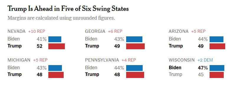 先说结论,基于 NYT/Siena 学院在 10 月 22 日至 11 月 3 日期间,对影响美国大选格局最为重要的六大 " 摇摆州 "——亚利桑那、佐治亚、密歇根、内华达、宾夕法尼亚和威斯康辛州进行的民调显示,特朗普在前 5 个州取得 3%-10% 的领先,而拜登仅仅在威斯康辛州领先 2%。