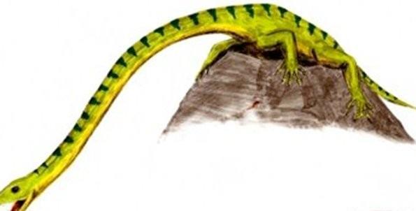一种滑行爬行动物,后腿有两个“翅膀”,前腿有两个小的“翅膀”。一些科学家认为它与蛇颈龙有关,但它将翅膀倒转到腿上而不是手臂上,这一点令人怀疑。