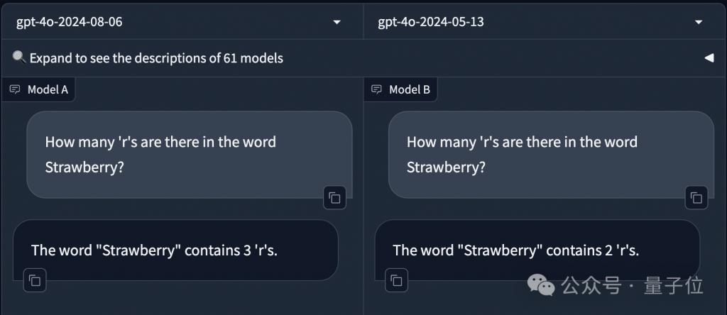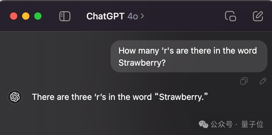 最近比较流行的几项大模型智商检测里,"Strawberry 里有几个 r",ChatGPT 新版模型和 gpt-4o-2004-08-06 都只能在特定问法下做对。