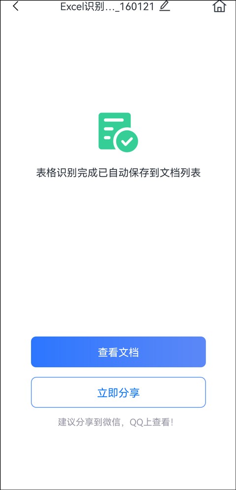 识别过程非常迅速,系统完成后,将自动保存excel表格在手机内存中,需要在线查看该文档,点击“查看文档”;