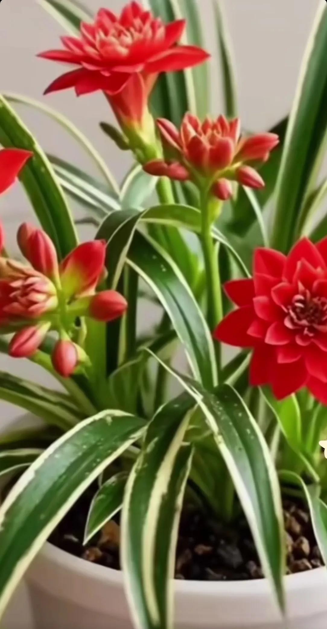 红花就像燃烧的火焰,温暖而无拘无束。在绿叶和乳白色的花朵的映衬下,它们特别耀眼。它们肆意地伸展着花瓣,仿佛在释放生命的激情。明亮的红色,是生命的颜色,是对更美好未来的愿景。这些红花,就像一个小火炬,照亮了整个植物,给室内带来了温暖和活力。