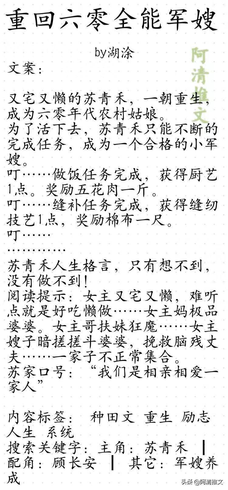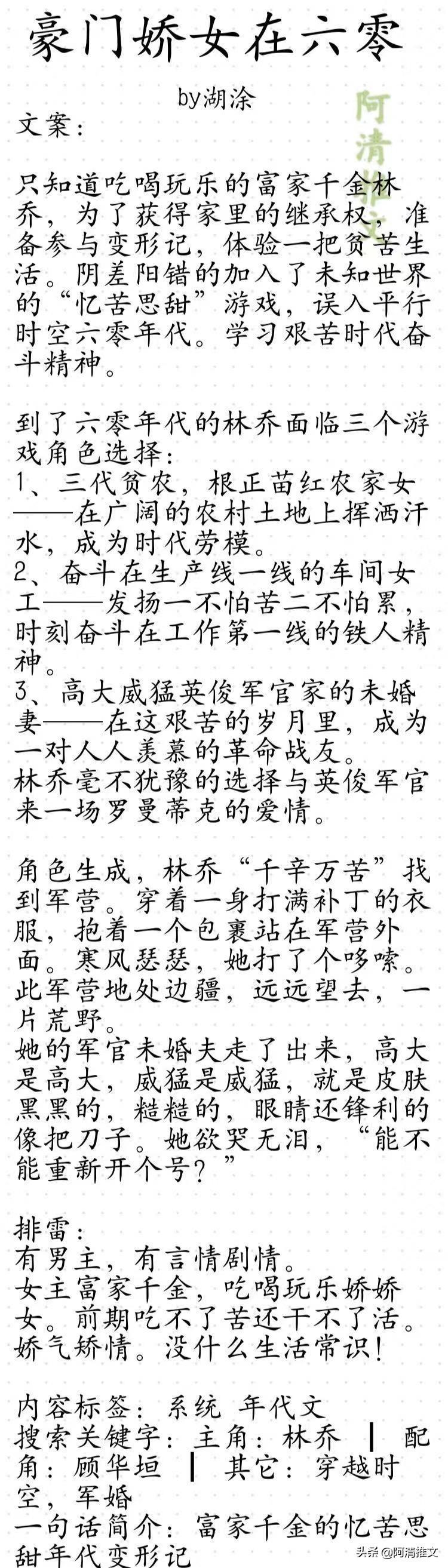 啊,阿清真的超级喜欢湖涂大大写的年代文小说的,虽然都是五六七十年代文的背景,但是人物人设都完全不一样,写作视角也不一样,文笔好好,真的爱了爱了。今日就安利大大的几本年代文给你们,真的要看它们!!!!