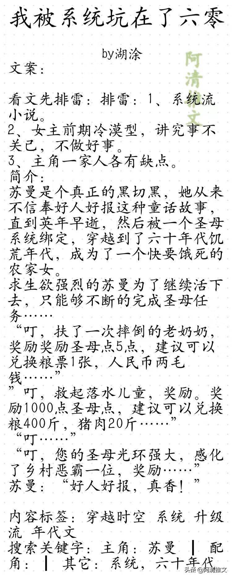 3.《我被系统坑在了六零》这本的设定也是很新颖的,小说人物人设都不是很完美,各有各的缺点,但是汇聚成一个故事就很出彩,就活了,描写的很生动!