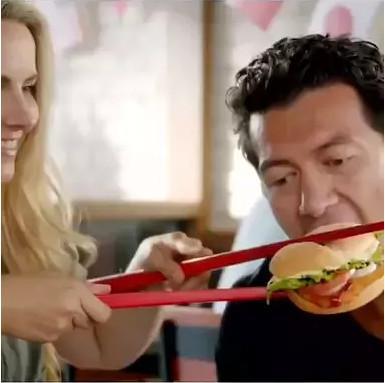 他们用筷子夹汉堡,并将汉堡笨拙的塞进嘴里。这样的筷子还不是普通型号,或许是为了突出筷子,广告片中用的都是巨型的红色大粗筷子。