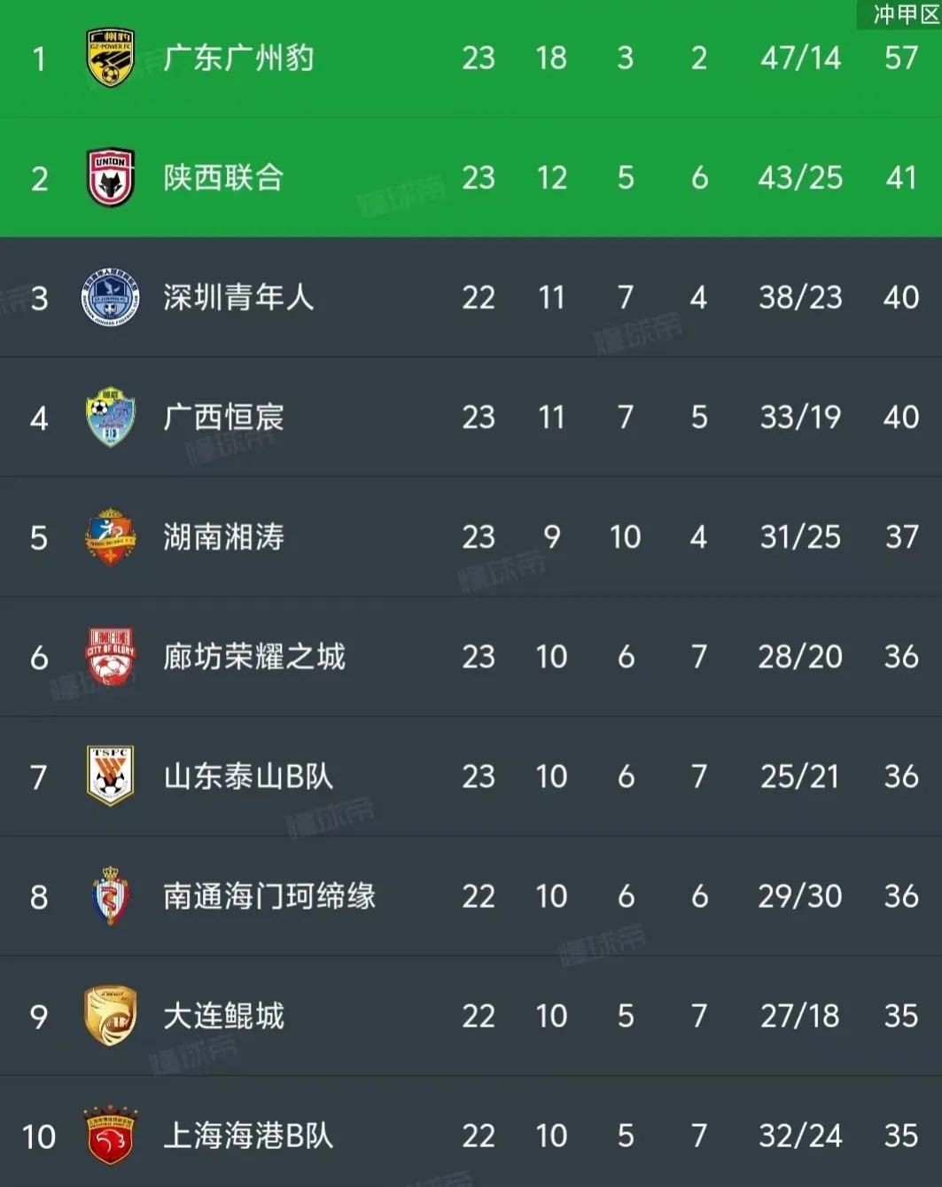 至此在中乙还剩五轮的情况下,广东广州豹积57分位居争冠组第一位,领先第二名的陕西联合16分提前锁定一个中甲名额,深圳青年人、广西恒宸40分一分只差排在三、四名,湖南湘涛37分第五,廊坊荣耀之城、山东泰山B队、南通海门珂缔缘同积36紧随其后,大连鲲城、海港B队末尾