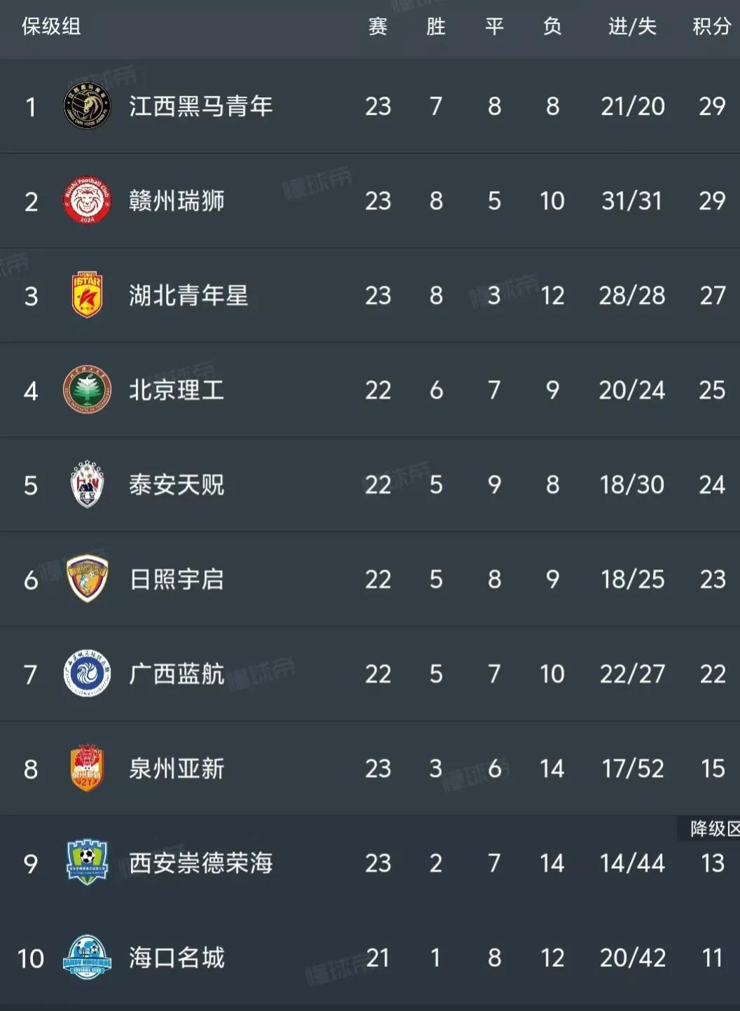 在保级组中江西黑马青年、赣州瑞狮同积29分排在第一、二位,湖北青年星积27分排在第三位,北京理工25分第四,泰安天贶24分第五,日照宇启23分第六,广西蓝航22分第七,泉州亚新15分第八,西安崇德荣海13分、海口名城11分降级区!