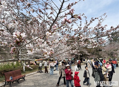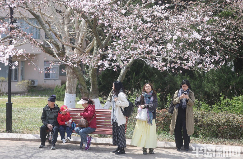 4月3日,青岛中山公园内前来赏樱花的游人络绎不绝,樱花大道上熙熙攘攘的非常热闹,几乎每棵樱花树下都有游客在拍照。