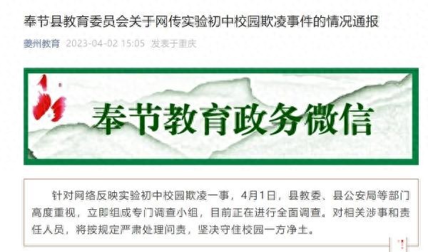奉节县教育委员会关于网传实验初中校园欺凌事件的情况通报