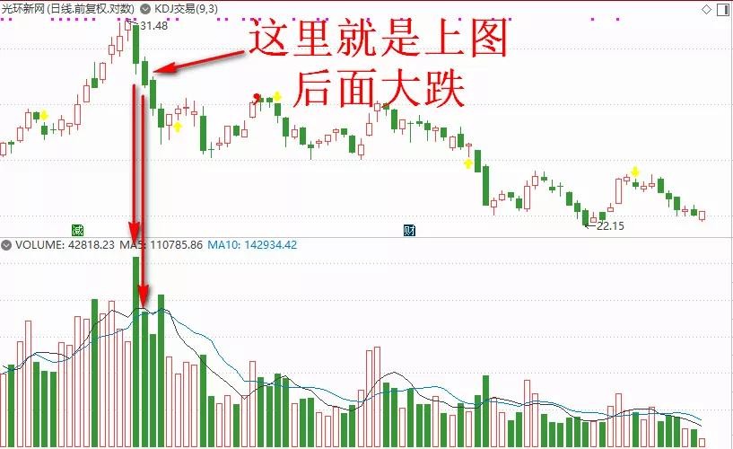 上图中,阴量和前面阳量比,都是小,这就是下跌缩量,到底是好,还是不好呢,我们看后面走势,后面大跌