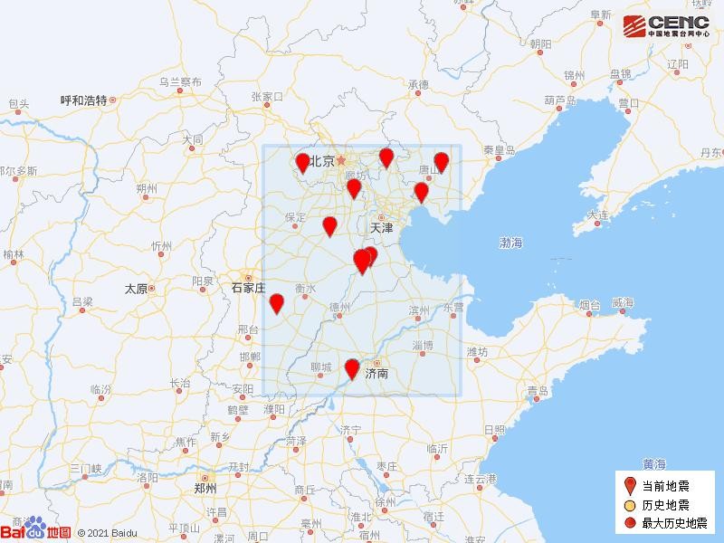根据中国地震台网速报目录,震中周边200公里内近5年来发生3级以上地震共11次,最大地震是2020年7月12日在河北唐山市古冶区发生的5.1级地震(距离本次震中227公里),历史地震分布如图。