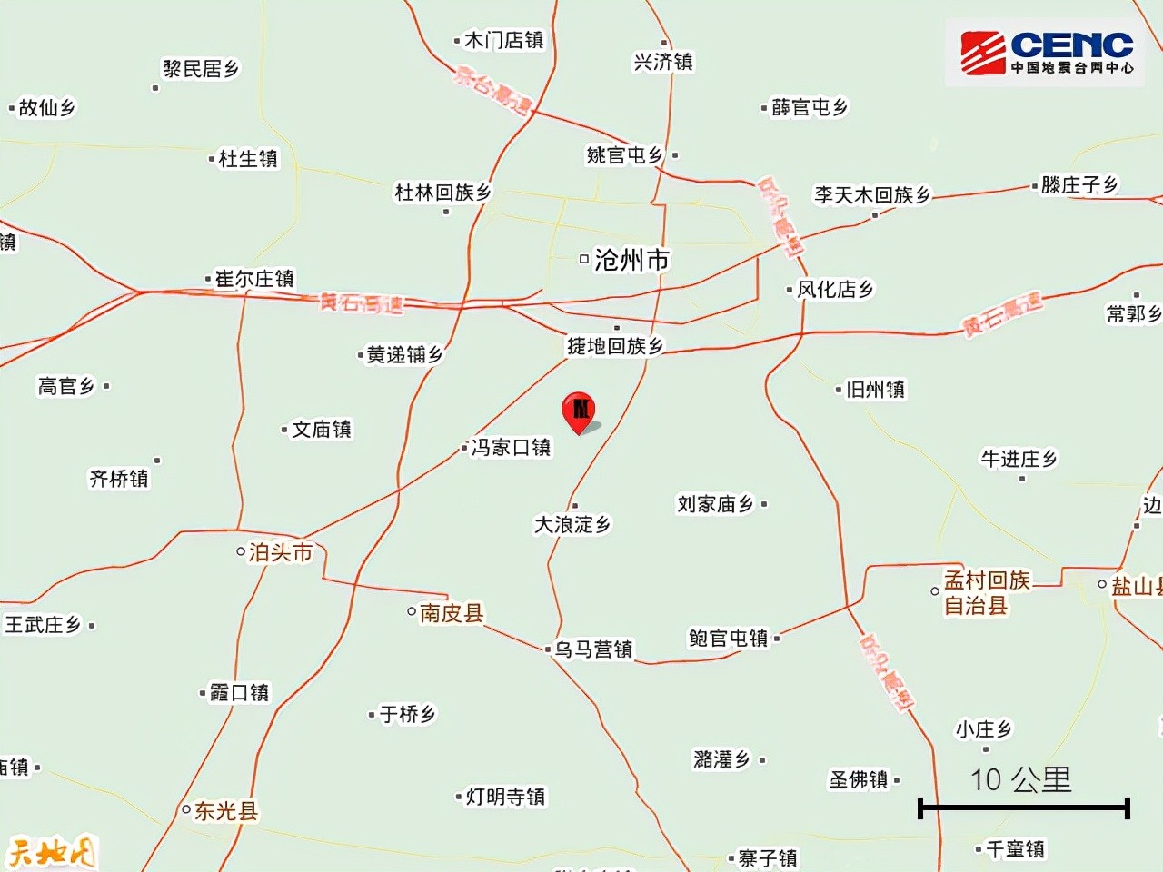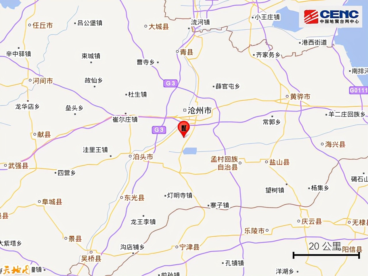 据中国地震台网正式测定,11月3日13时51分在河北沧州市沧县发生2.9级地震,震源深度10千米,震中位于北纬38.17度,东经116.83度。