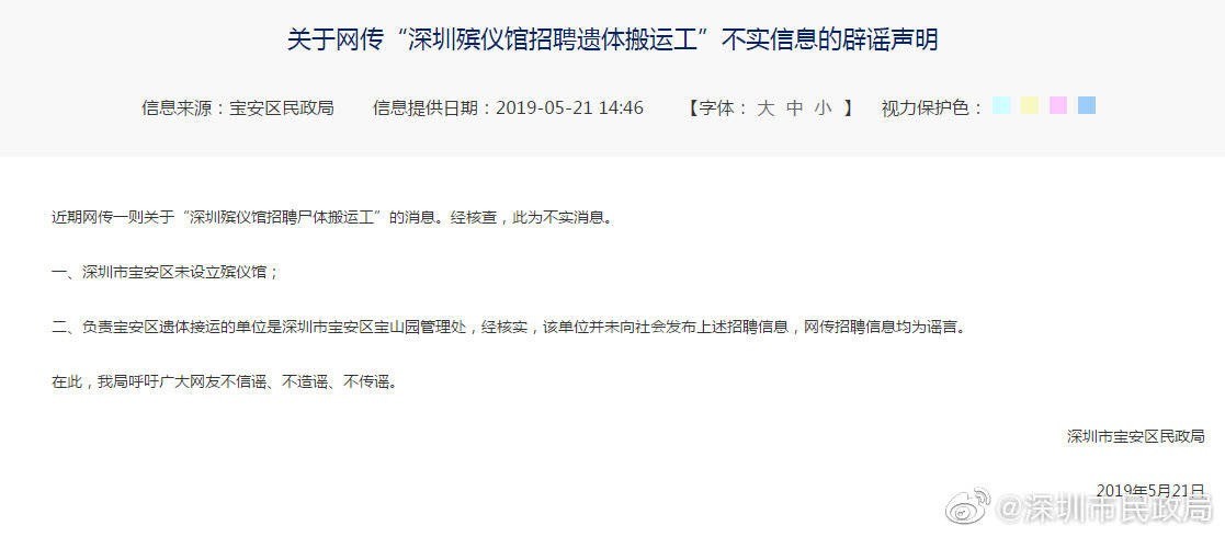声明称,深圳市宝安区未设立殡仪馆;负责宝安区遗体接运的单位是深圳市宝安区宝山园管理处,经核实,该单位并未向社会发布上述招聘信息,网传招聘信息均为谣言。