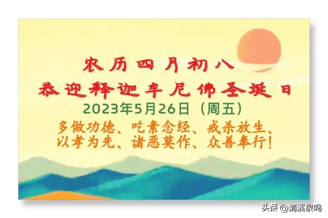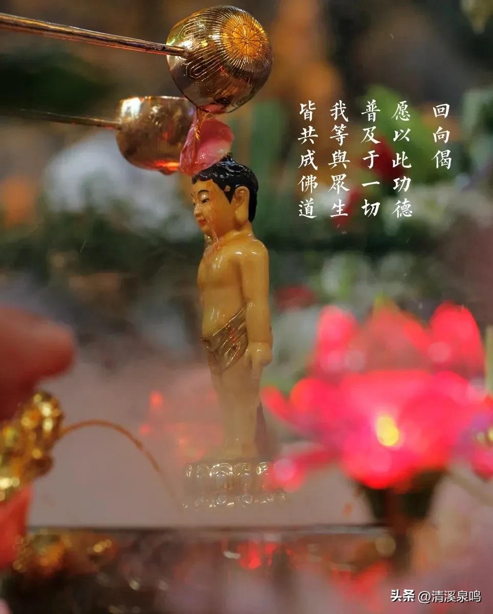 2023年5月26日农历四月初八,是佛祖释迦牟尼佛圣诞,又称佛诞日、浴佛节、龙华会、洗佛节、灌佛会等。四月初八释迦牟尼诞辰日,相传这天,释迦牟尼以一手指天一手指地的造型,出生在百花齐放的无忧树下,有九条龙为他吐水沐浴,即“九龙吐水”,是一种祥和美满的吉兆,也叫浴佛节。这天,各大寺院庙宇会设置一个大佛盘,盘中莲台立着一个稚气可爱的吉祥佛,人们用勺子舀清水,像九龙一样给吉祥佛沐浴。