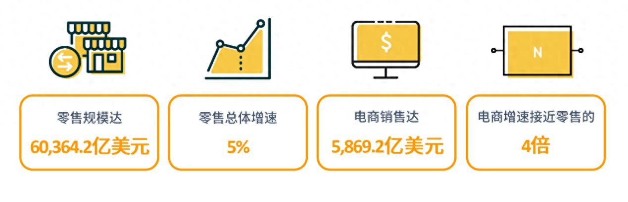 美国是一个充满活力的经济大国,2018年零售规模已达60364.2亿美元,同比增速高达5%,在发达国家中排名第一。虽然看上去5%的增速不高,但是考虑到美国的零售规模,每年的增量已经非常惊人了。