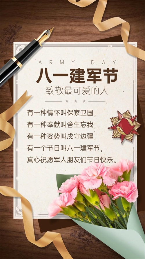 10、有一首歌,叫“军中绿花”,歌声悠悠,情意浓浓;有一段情,叫“军旅之情”,战友之情,天长地久;有一个节,叫“八一建军”,真心祝福,问候传递!