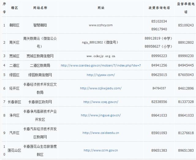 2018年长春市各城区、开发区学校学区查询网站及招生入学咨询电话