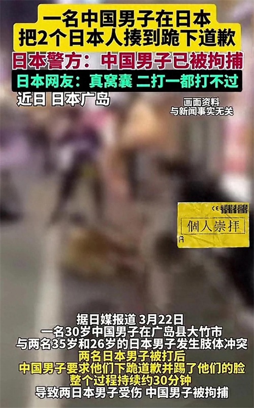 日本媒体报道了这样一则有趣的新闻,一个中国男子在日本把两个日本人揍的磕头求饶!