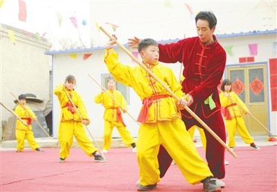 近日,市开发区前楼下村拳师张均合正在指导小学生练习小洪拳。 寒假期间,市开发区前楼下村30多名小学生在当地非遗传承人张均合拳师的指导下,习练该村具有600多年历史的传统武术小洪拳。(本报记者 田晓丽摄)