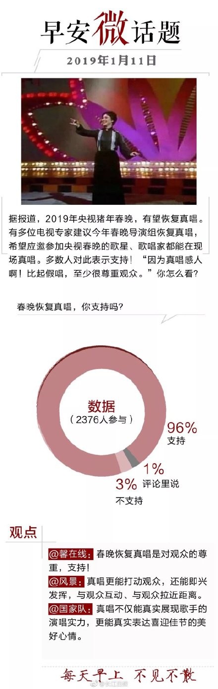 今日微话题【春晚恢复真唱,你支持吗?】据报道,2019年央视猪年春晚,有望恢复真唱。有多位电视专家建议今年春晚导演组恢复真唱,希望应邀参加央视春晚的歌星、歌唱家都能在现场真唱。多数人对此表示支持!“因为真唱感人啊!比起假唱,至少很尊重观众。”