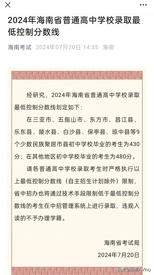 近日,海南省考试局发布了中招录取分数线,最低430分主要针对少数民族聚居市县,其他海口、临高、儋州、澄迈等市县最低480分。