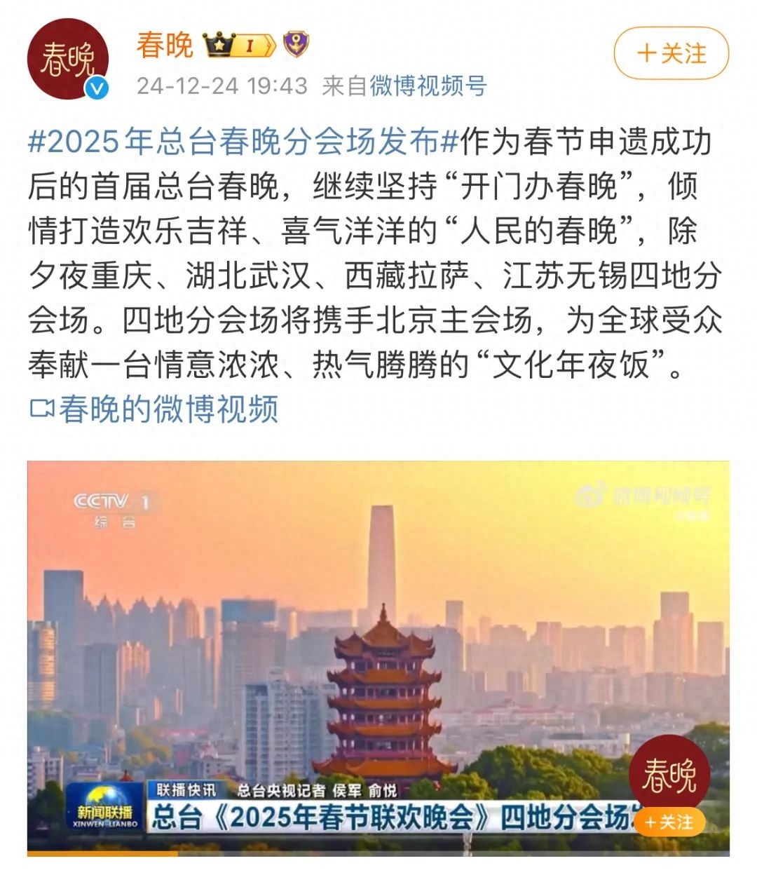 刚刚,2025年央视春晚分会场发布,武汉与无锡、重庆、拉萨一起,成为2025年央视春晚的分会场。