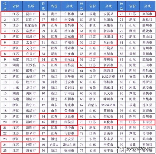 图中红色方框框起来的便是江苏省入榜2023年百强县的名单排名,不得不说实在是强,全省共24县入榜,其中前十名中就有六名被江苏省“霸占”,而且整个榜单的前四位也全部被江苏省包揽。