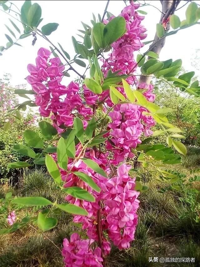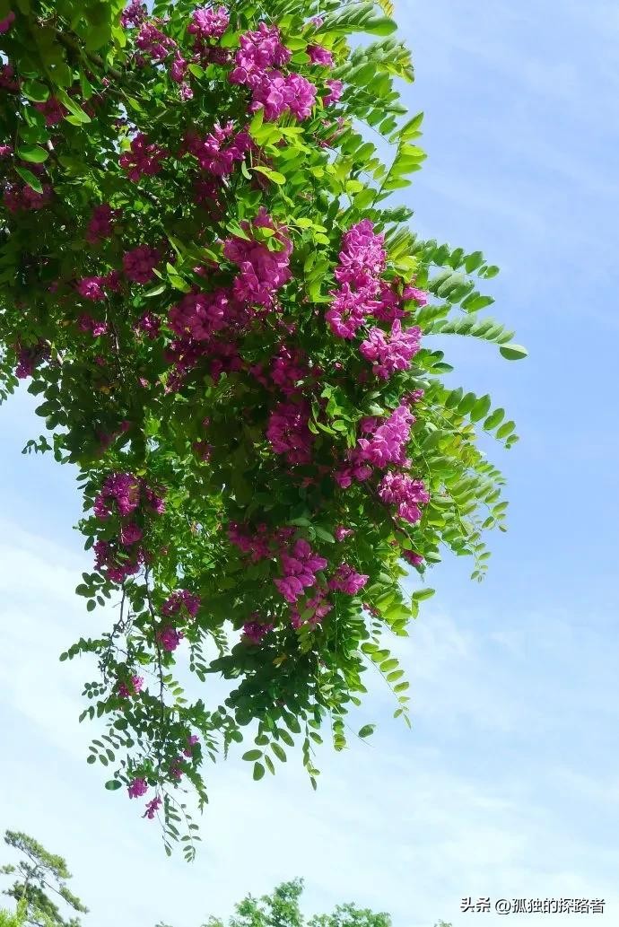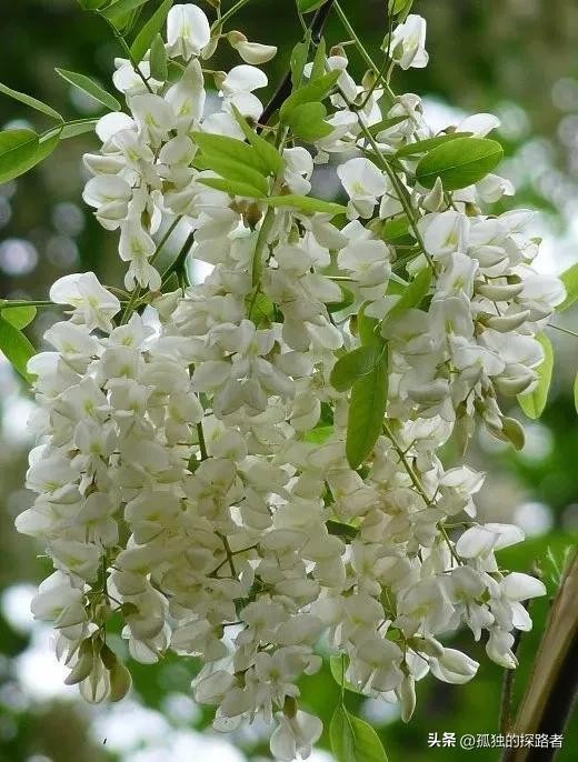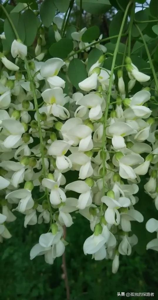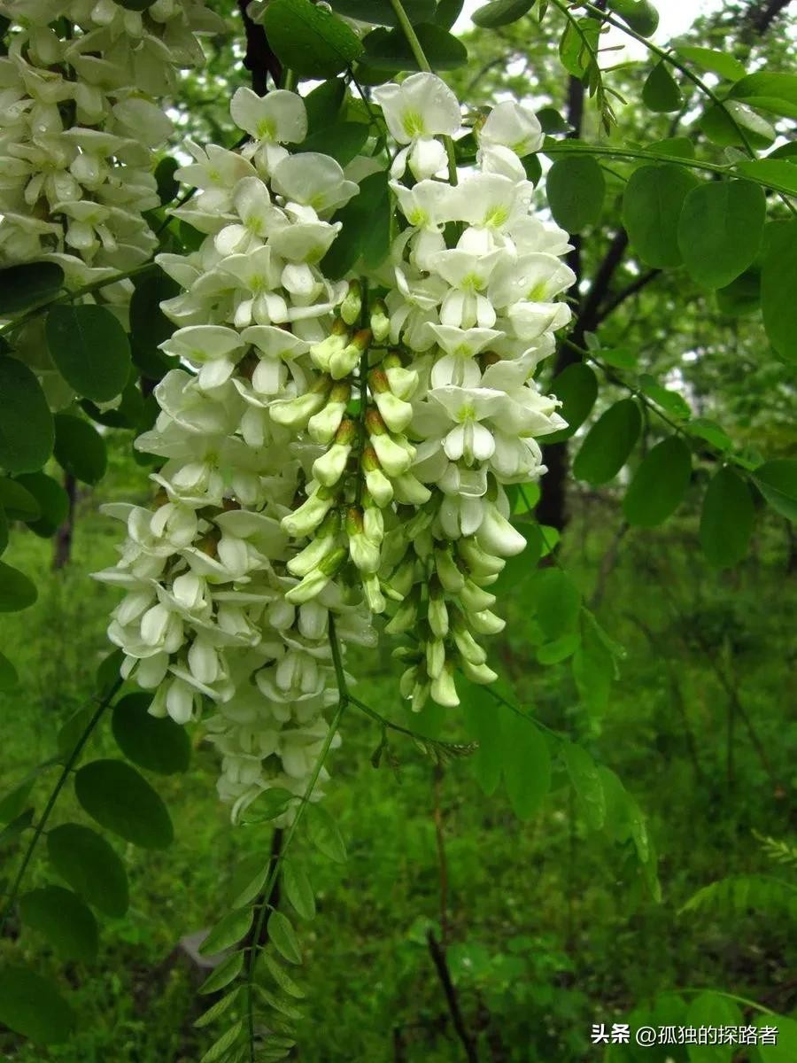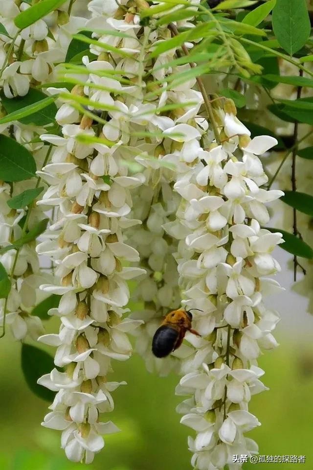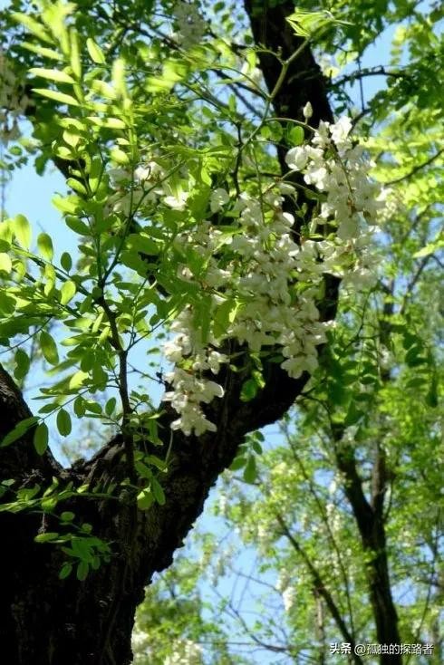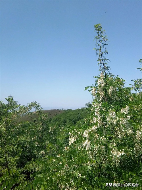 更像一粒粒碎金子,也许是土地爷爷给礼物,出树林的那一刻回头遥望,在蓝色天空的映衬下,那一树树雪白更加轮廓分明,满树白花的槐林高低起伏,在天际间勾勒出一条自然而又完美的线条。