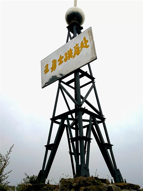 这座山崖大约直径不足十米,四周都是钢制坚固围栏,崖上立有钢板制作的三角形塔架,塔架上立有牌匾“五勇士跳崖处”。