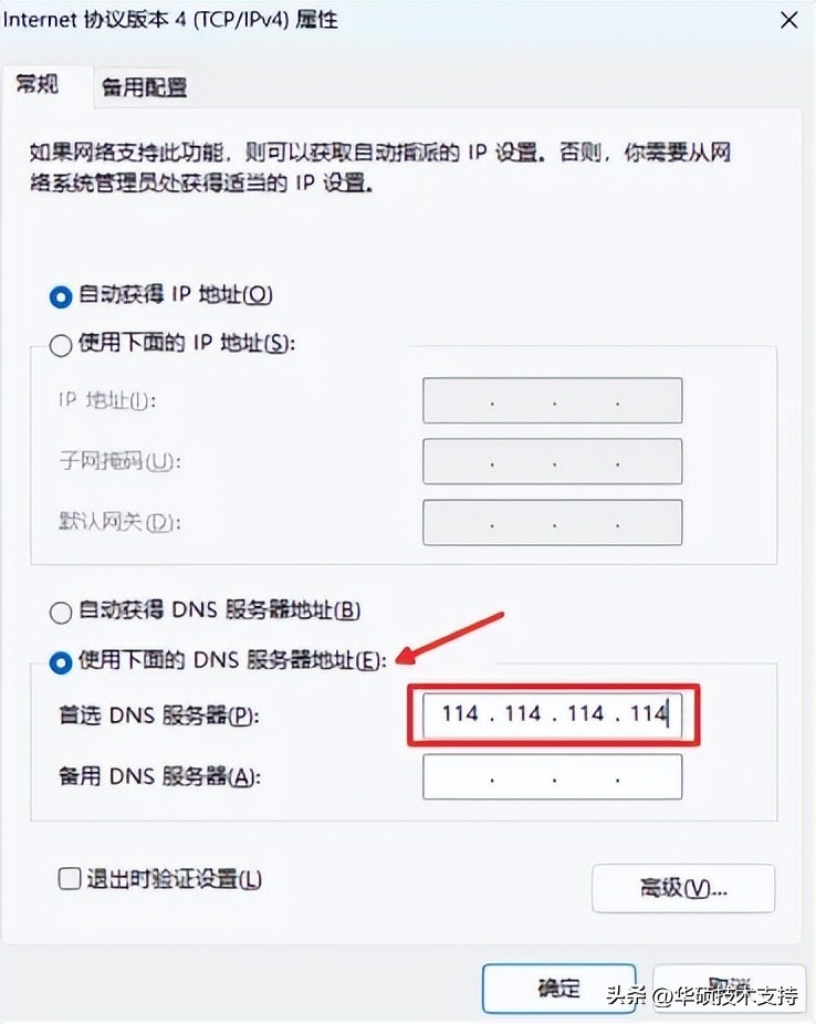 ⑤选择【使用下面的DNS服务器地址(E)】,在【首选DNS服务器(P)】输入知名的DNS ip地址或者是网络服务商提供的地址(我们在这里输入的是114),点击【确定】。