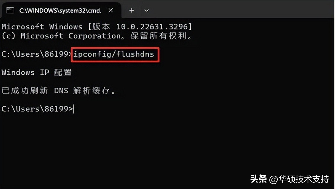 ③在指令界面复制【ipconfig/flushdns】这串指令,然后按【Enter】,出现【已成功刷新DNS解析缓存】即可关闭界面。