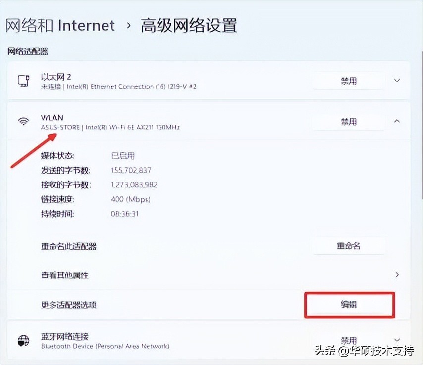 ③点开【WLAN】,选择【更多适配器选项】的【编辑】。