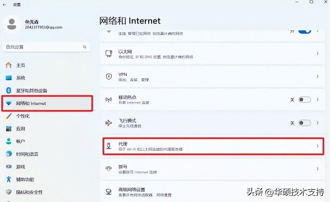 ②在设置界面选择【网络和Internet】,然后点击右侧的【代理】。