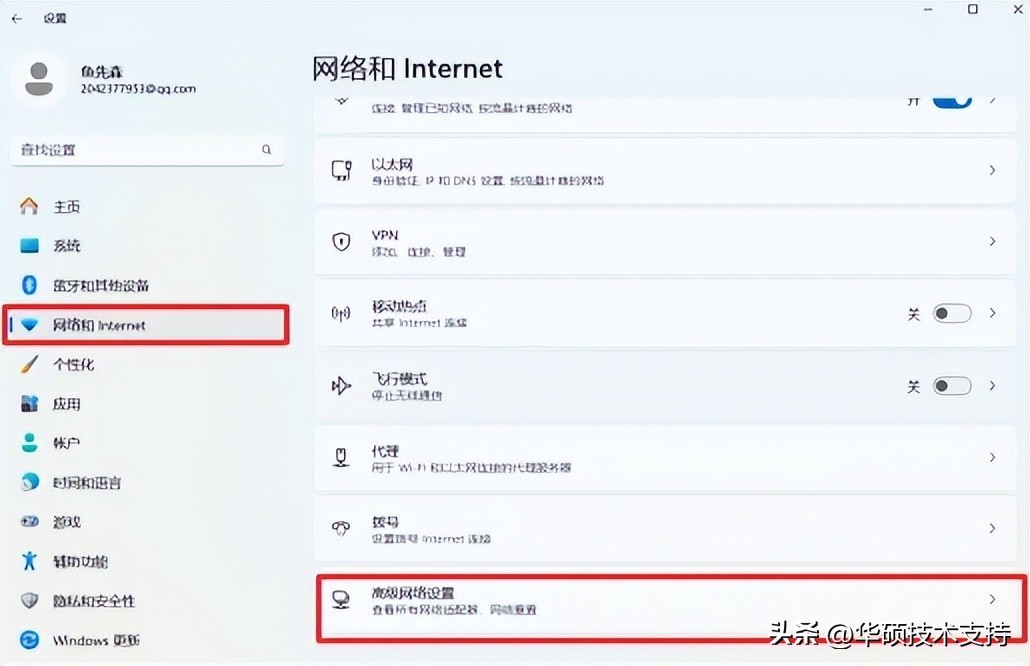 ②在设置界面选择【网络和Internet】,点击【高级网络设置】。