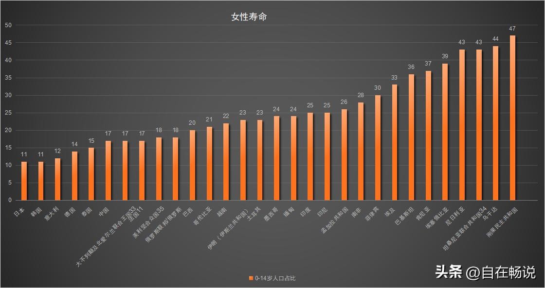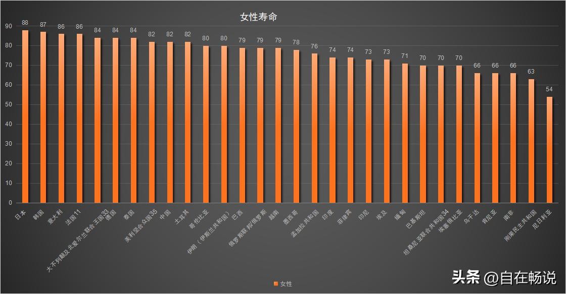 女性与男性寿命排名相似,2023年日本女性平均寿命达到88岁排名第一,韩国87排名第二,意大利、法国86岁,并列第三;英国、德国、泰国并列第五,寿命84岁;美国、中国、土耳其并列第八,寿命82岁。女性寿命最低的是依然是尼日利亚,只有54岁。