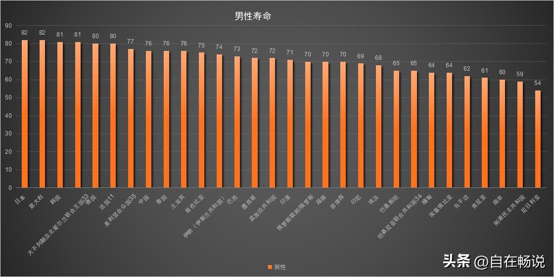 寿命排名中,日本、意大利男性并列第一,都可以达到82岁;韩国、英国男性寿命81岁,并列第三;德国、法国男性寿命80岁,并列第五;美国77岁排名第七,我国男性与泰国、土耳其寿命全部达到76岁明磊第八名。2023年尼日利亚男性平均寿命最低,只有54岁。