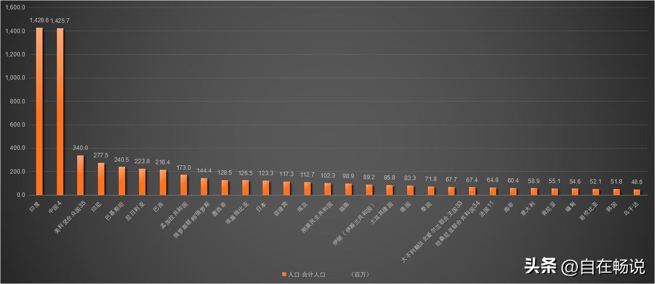 人口数量前三十名国家中,中印可以说断层领先后面的国家,印度在2023年总人口达到14.286亿,而中国(未包含港澳台)达到14.25亿人,印度以微弱的优势超过了中国人口。