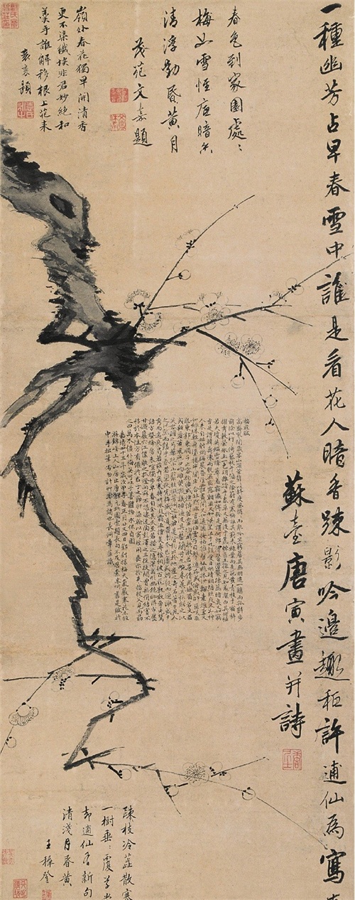 细看整个作品,梅花贯穿于整个条屏,但在留白的地方,被唐伯虎写满了诗句。这一种诗画结合的作品并不多见。仔细看绘画,整个画面的清新感觉还是很明显的。但绘画的笔墨力度与梅花成了重点表现的地方。