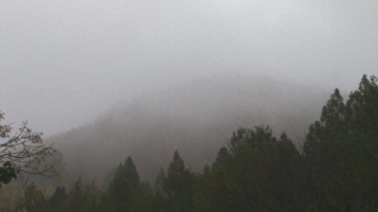 近处只听见池塘里、草叶上清脆的雨滴,“叮叮咚咚”,一条石头小径向前延伸去,韵味十足。虽是初冬,但石门山上仍然是松柏长青,满目翠绿,郁郁葱葱。置身其中,犹如漫步在幻想的仙境里。