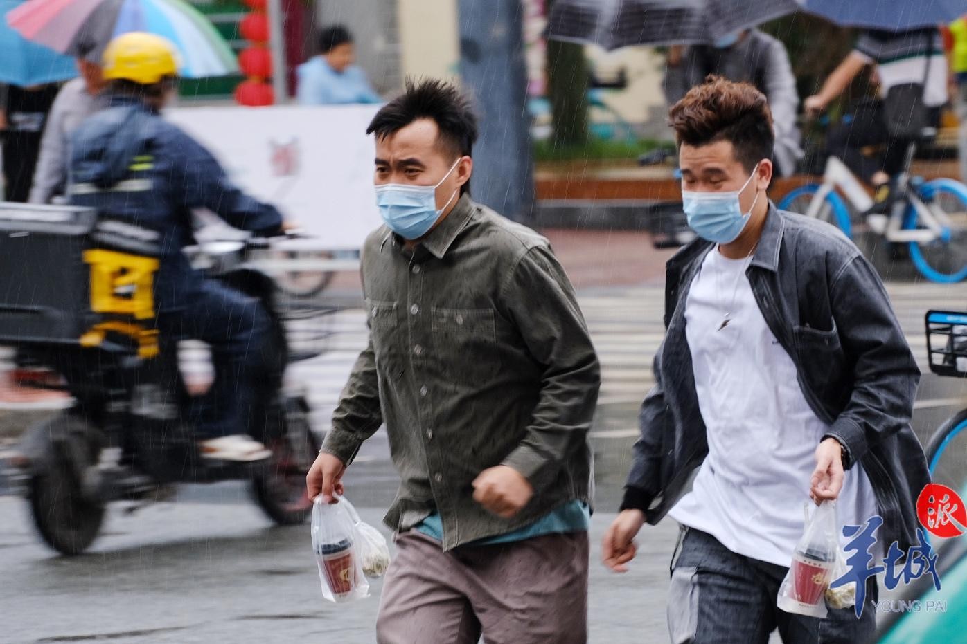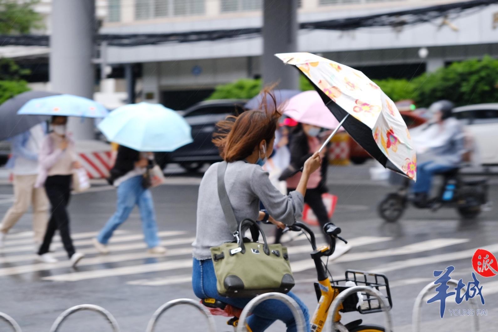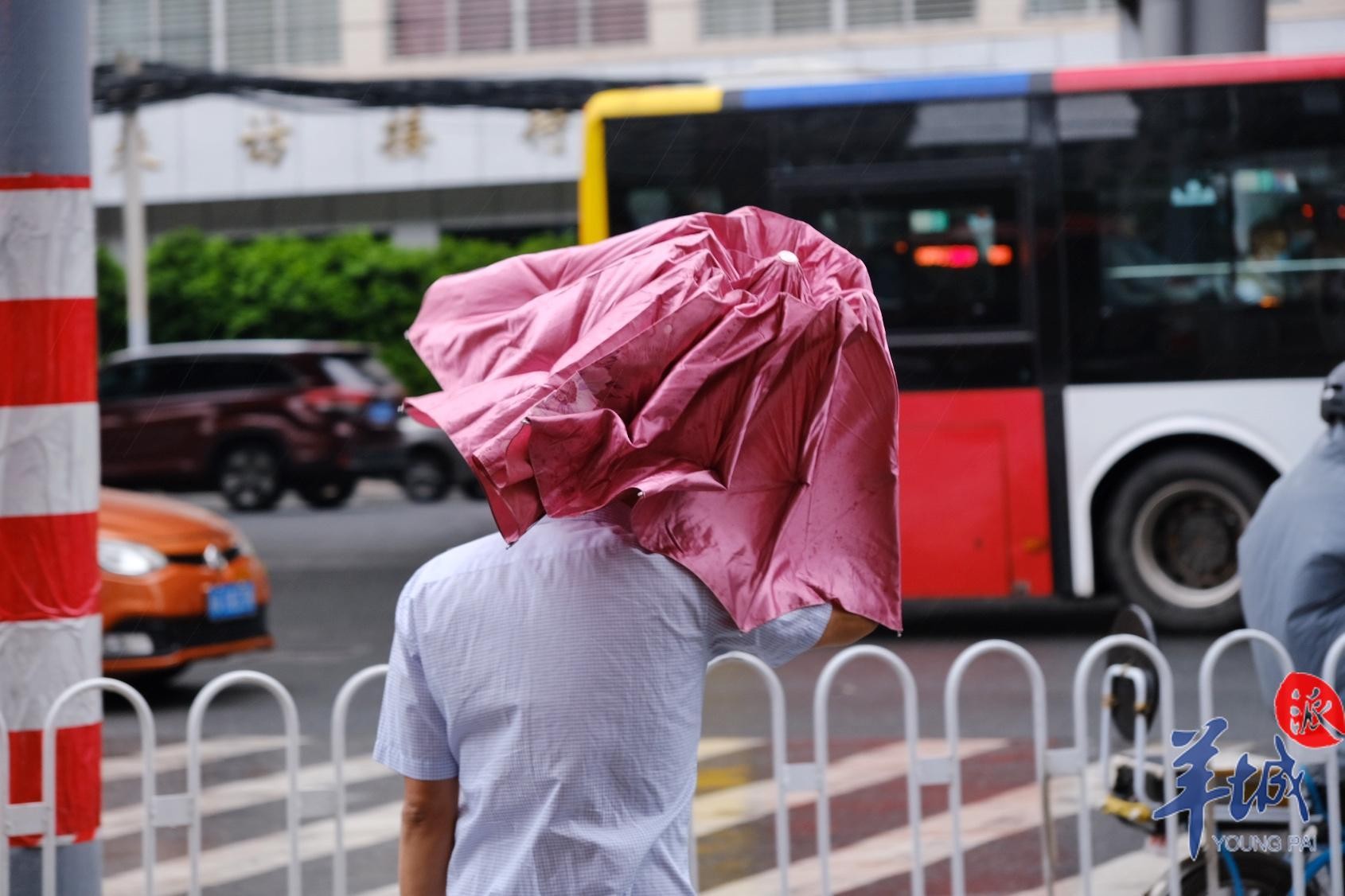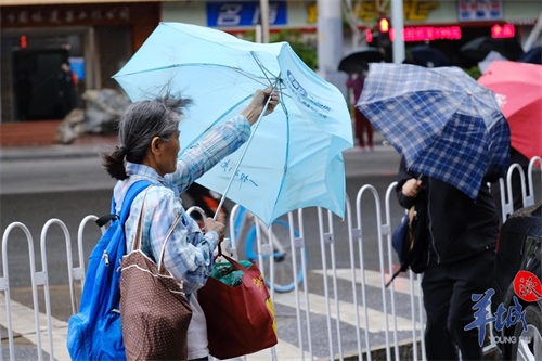 10月13日清晨,台风“圆规”携风雨给羊城带来丝丝“秋凉”,街坊们的外套、长袖纷纷出场。广州街头风呼呼吹,上班族、上学娃打着伞、穿着雨衣做足准备出门,但“圆规”的强劲风力让不少雨伞都有“骨折”风险。