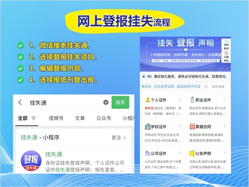 第二步:登报挂失。打开徽信搜索挂失通,选择身份证,编辑登报内容,选择便宜的报纸即可登报。