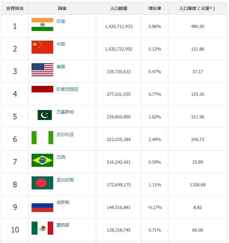 截止2023年07月,全球 240 个国家和地区人口总数为8,032,122,420人,其中印度以 1,426,711,933 人位居第一,成为世界上人口最多的国家,中国以 1,425,722,992 人位居全球第二,第三至第十名分别是:美国、印度尼西亚、巴基斯坦、尼日利亚、巴西、孟加拉国、俄罗斯、墨西哥;